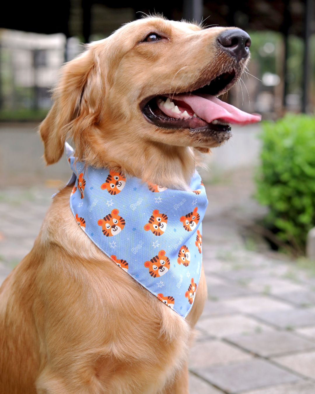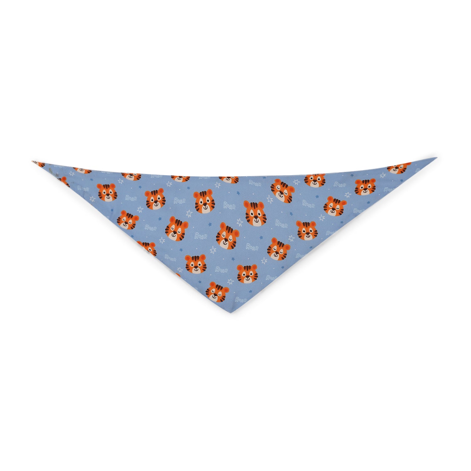 Set against a cheerful sky-blue background, this bandana features an array of adorable cartoon tiger faces, each with its own unique expression and the fun word "Roar!" interspersed. Little stars sprinkle across the pattern, adding an extra dash of whimsy to this charming design. It’s a perfect blend of cute and courageous!